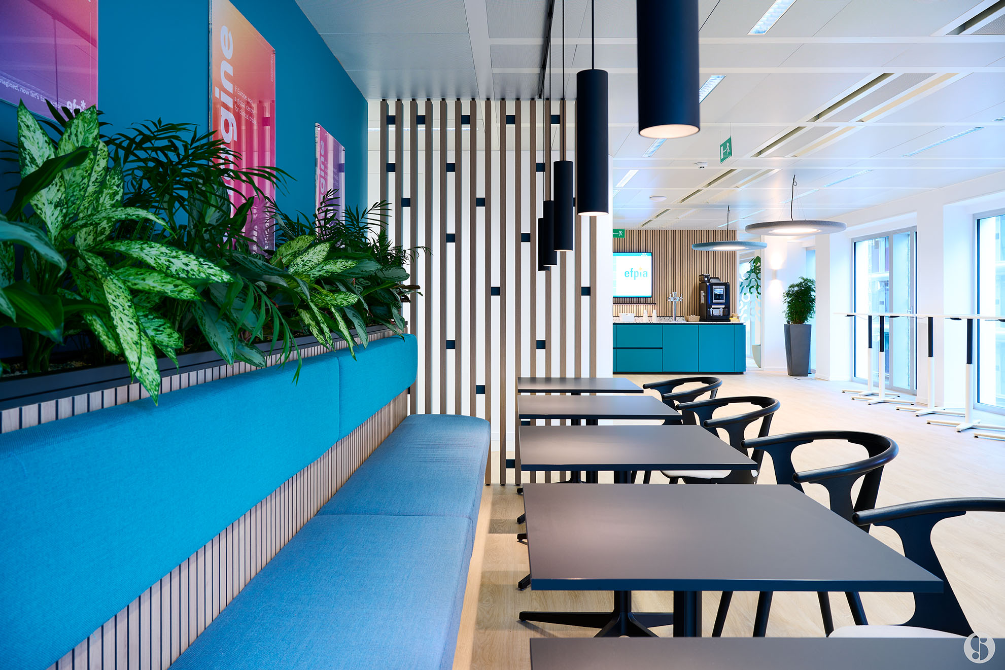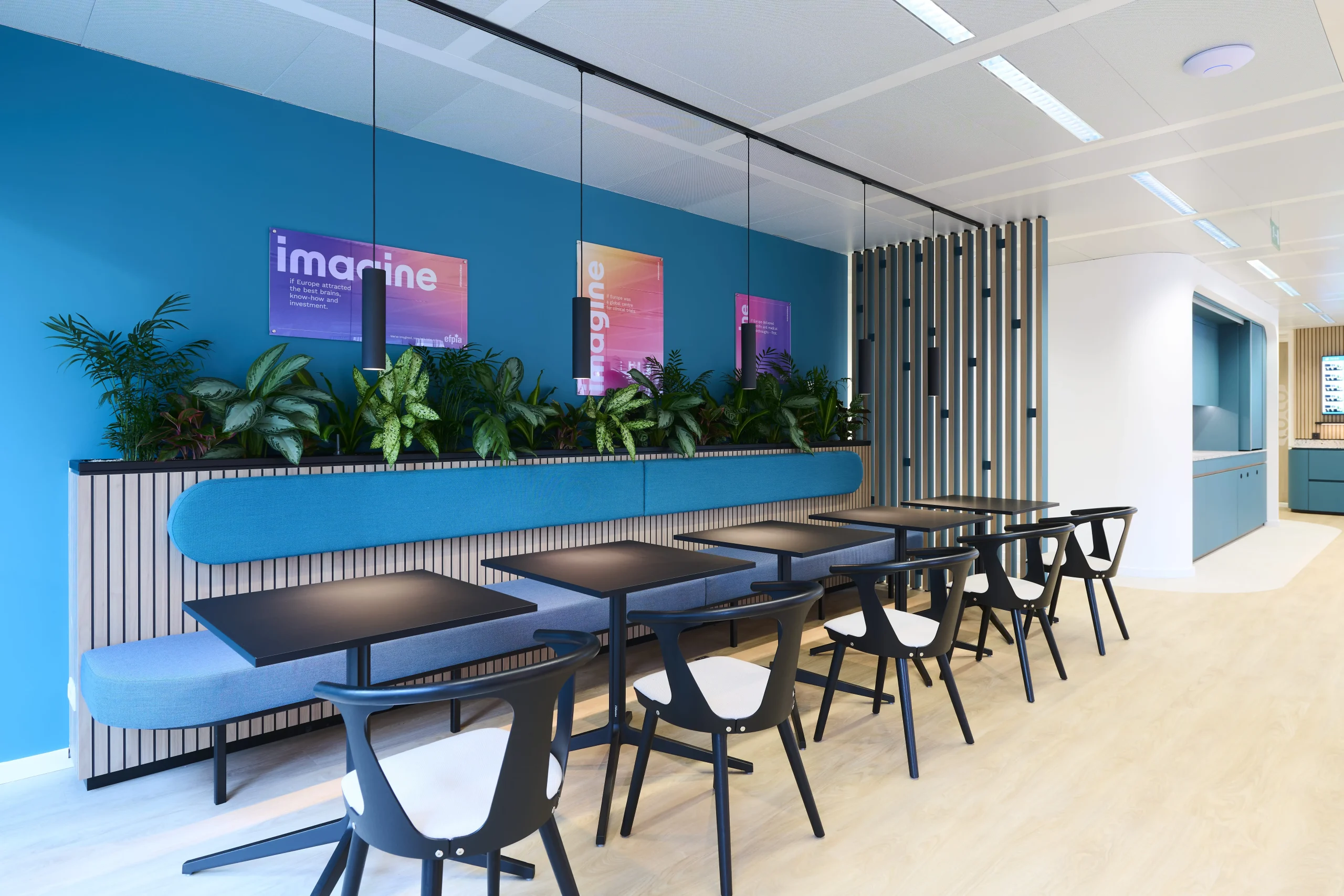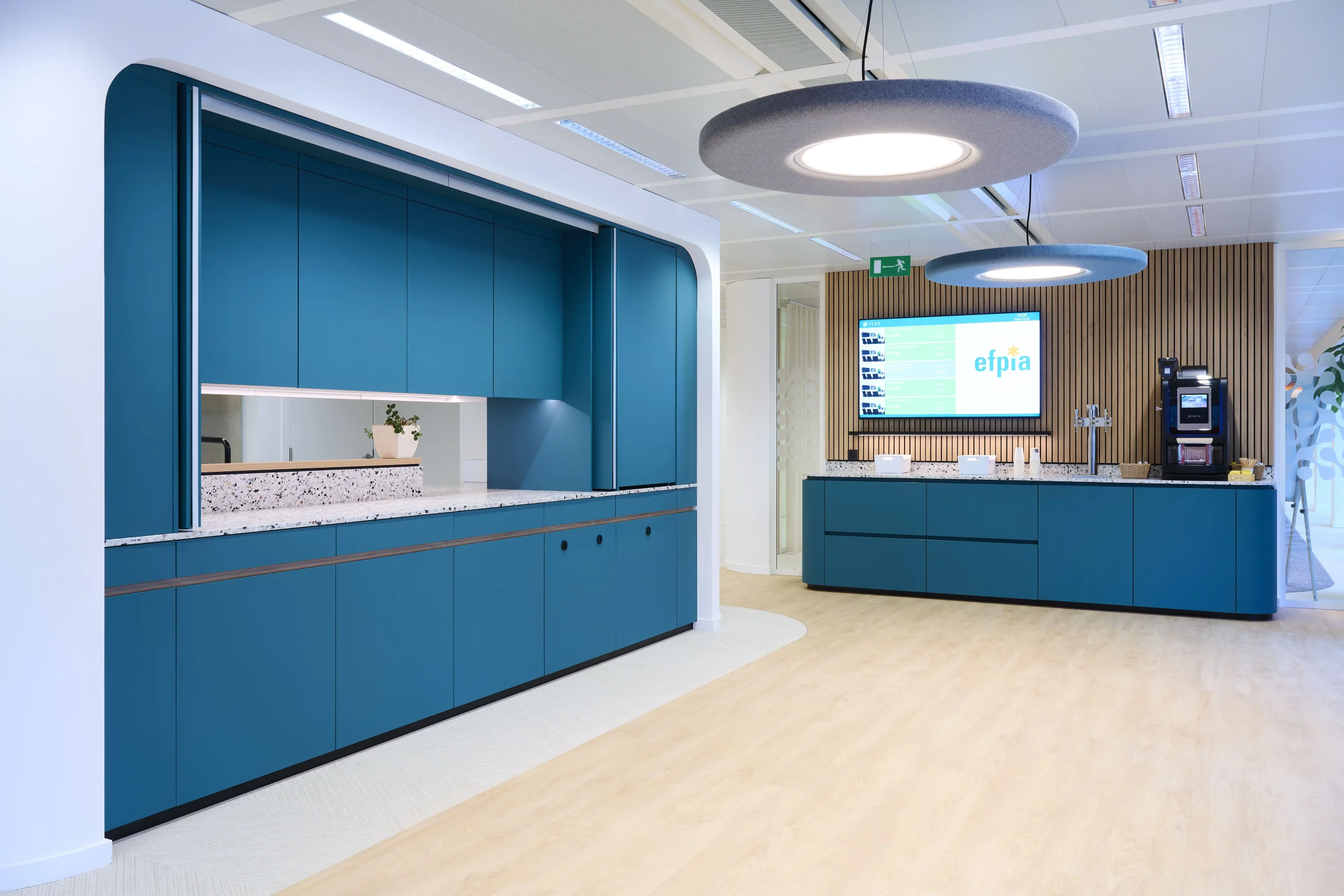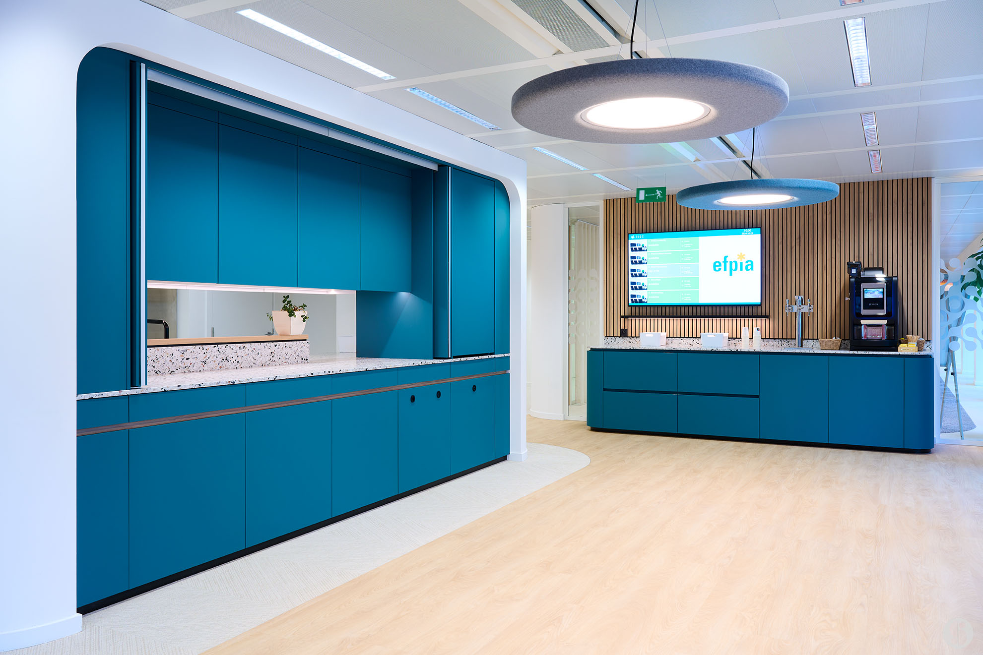 Nous avons aussi imaginé un espace de restauration fonctionnel, raffiné, moderne et chaleureux pour accueillir les membres et visiteurs. L’identité de l’EFPIA imprègne les lieux avec discrétion, mais avec sens. Le mobilier sur mesure, les matériaux nobles et un design fluide donnent, quant à eux, sa fonctionnalité et sa cohérence à l’ensemble.