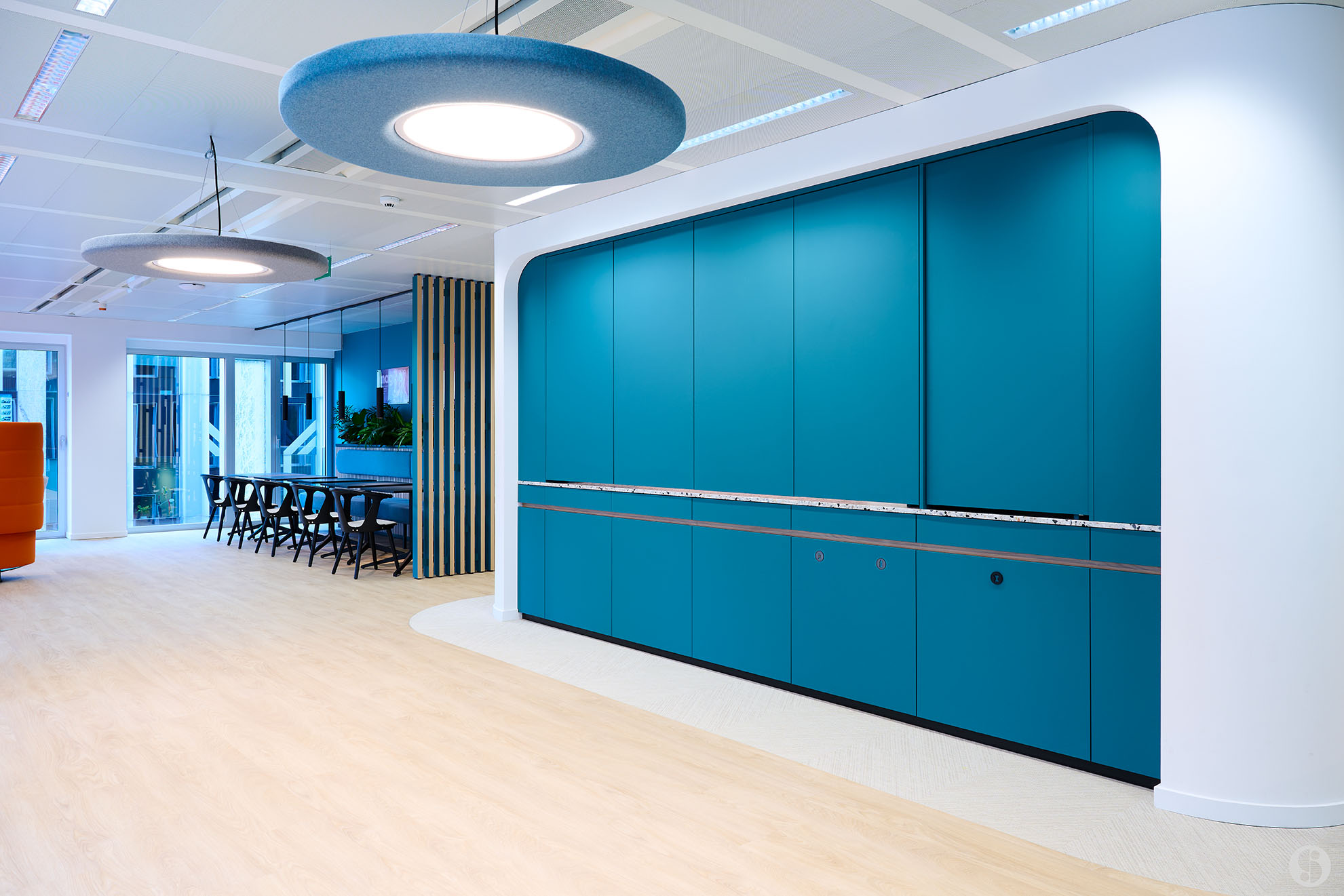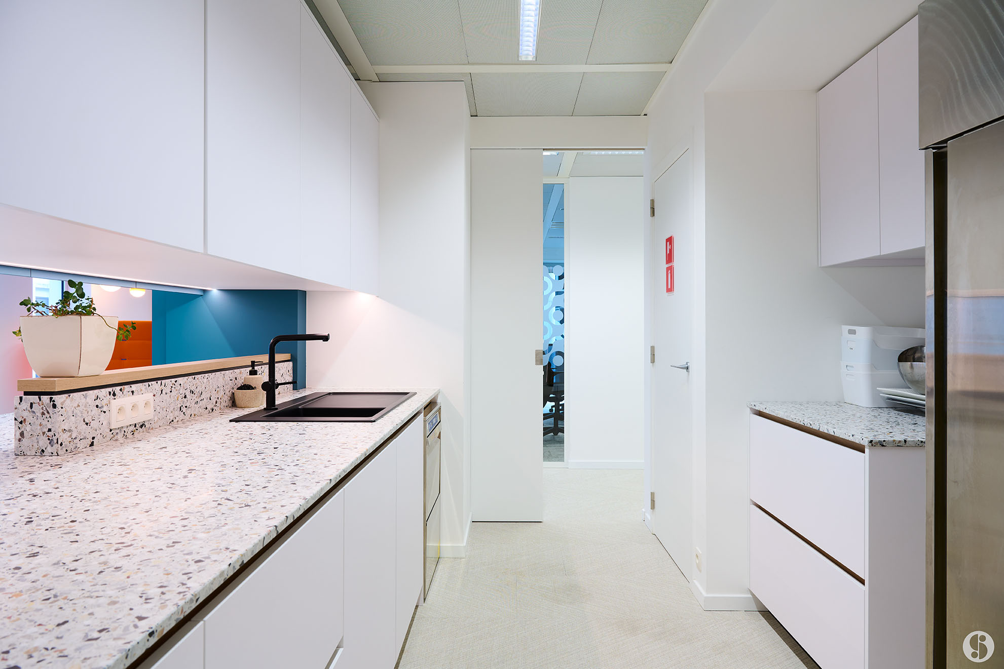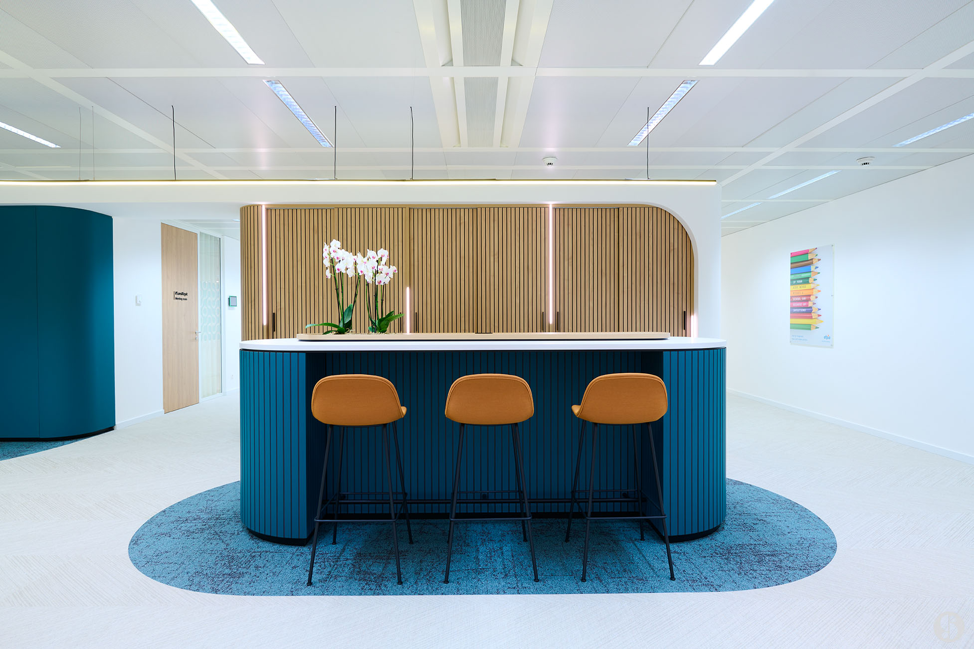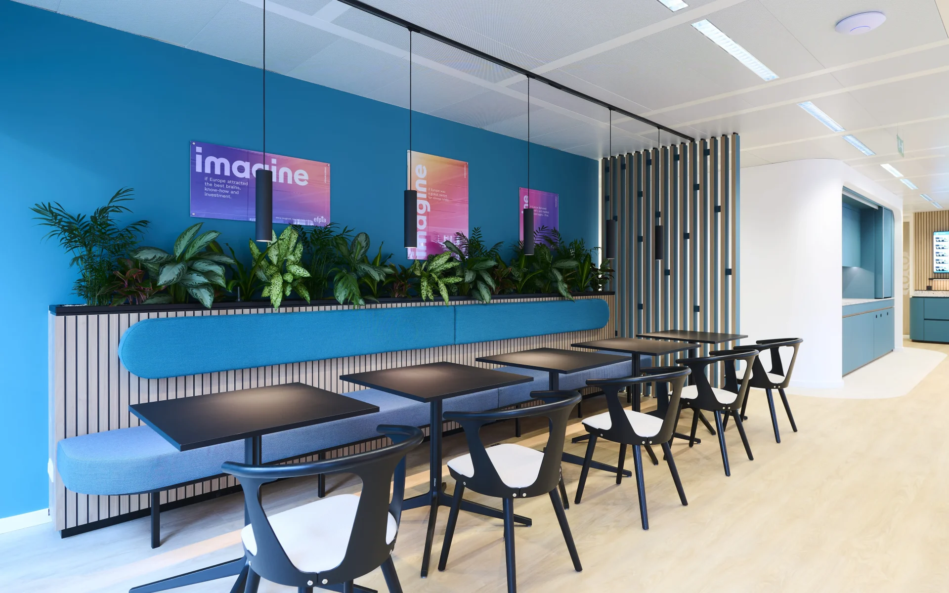 Nous avons aussi imaginé un espace de restauration fonctionnel, raffiné, moderne et chaleureux pour accueillir les membres et visiteurs. L’identité de l’EFPIA imprègne les lieux avec discrétion, mais avec sens. Le mobilier sur mesure, les matériaux nobles et un design fluide donnent, quant à eux, sa fonctionnalité et sa cohérence à l’ensemble.