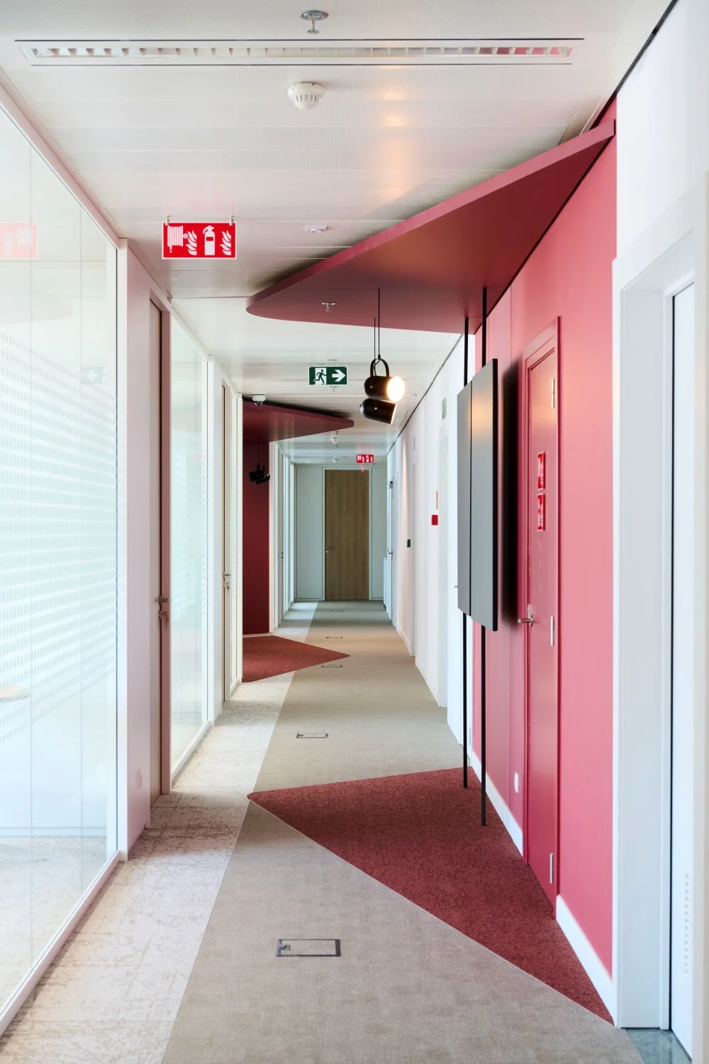 Long, closed corridors were broken open to create places where dialogue could flourish. Speech bubbles became spatial interventions : breakout points, display panels, and open zones, giving every message visibility and weight.